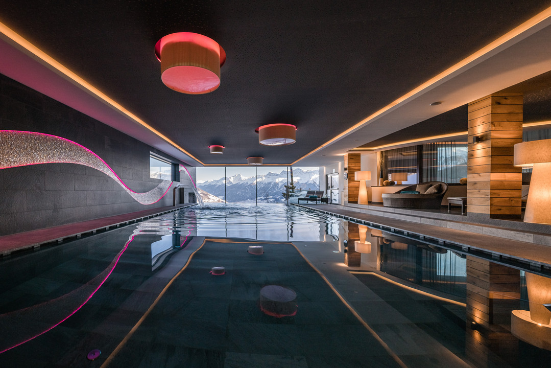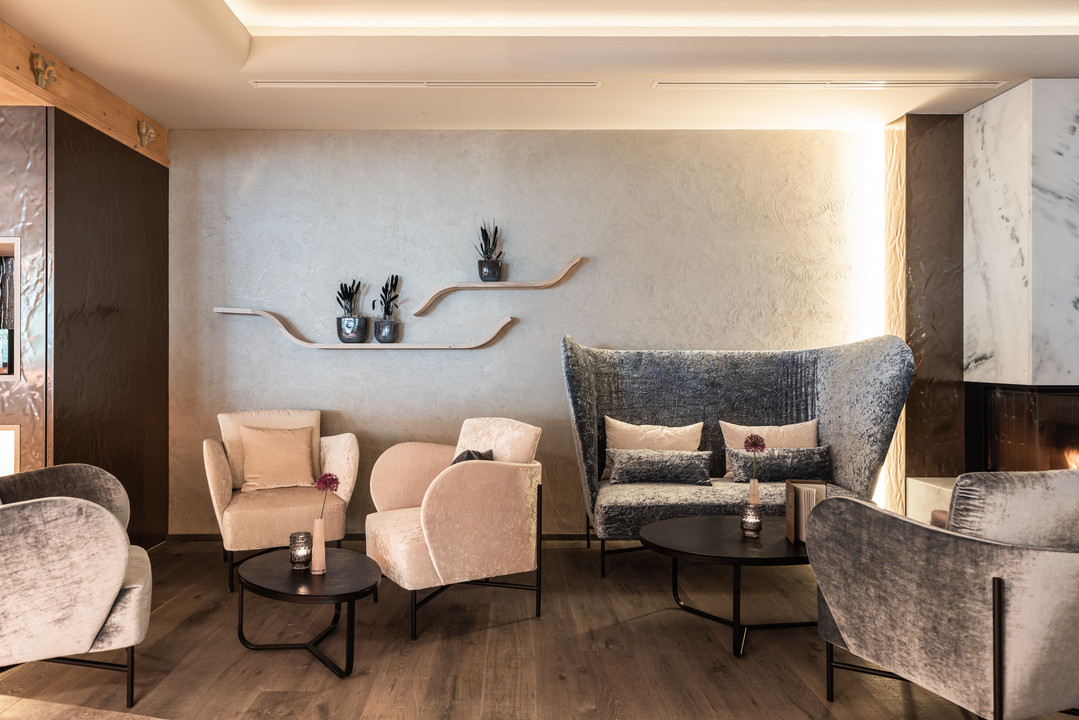 - Stanza relax in pino cembro, Relax Alm, lettini ad acqua nel "Night Corner" e lounge con cabine a raggi infrarossi