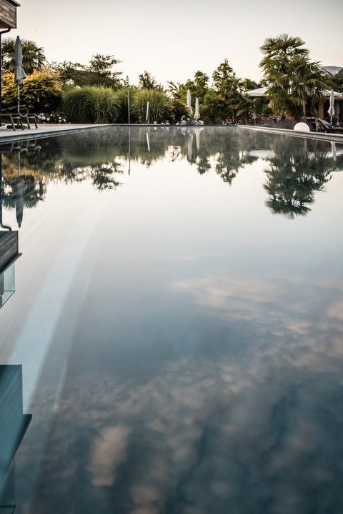 - Indoor Pool (31°C, 17x6 m) mit Schwimmschleuse in den Outdoor-Infinity-Pool (32°C, 23x5 m)