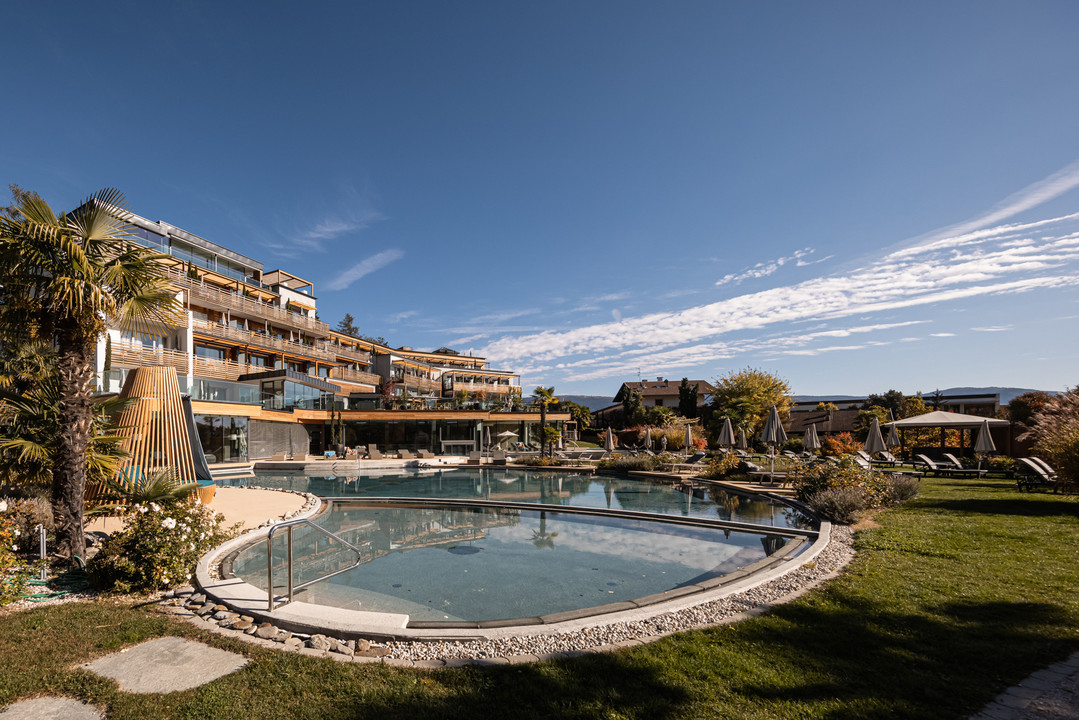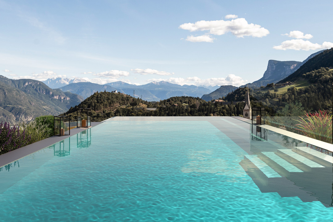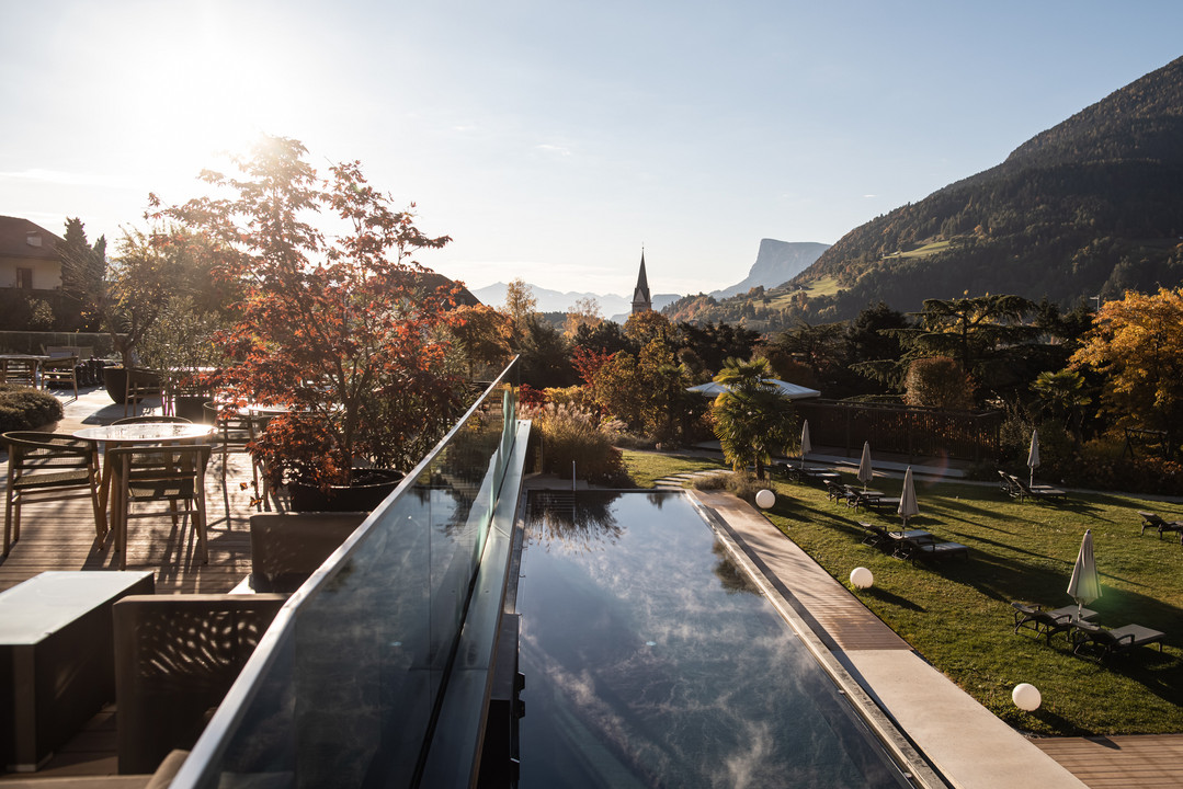 Ein paradiesischer Poolgarten vor Südtiroler Bergkulisse.