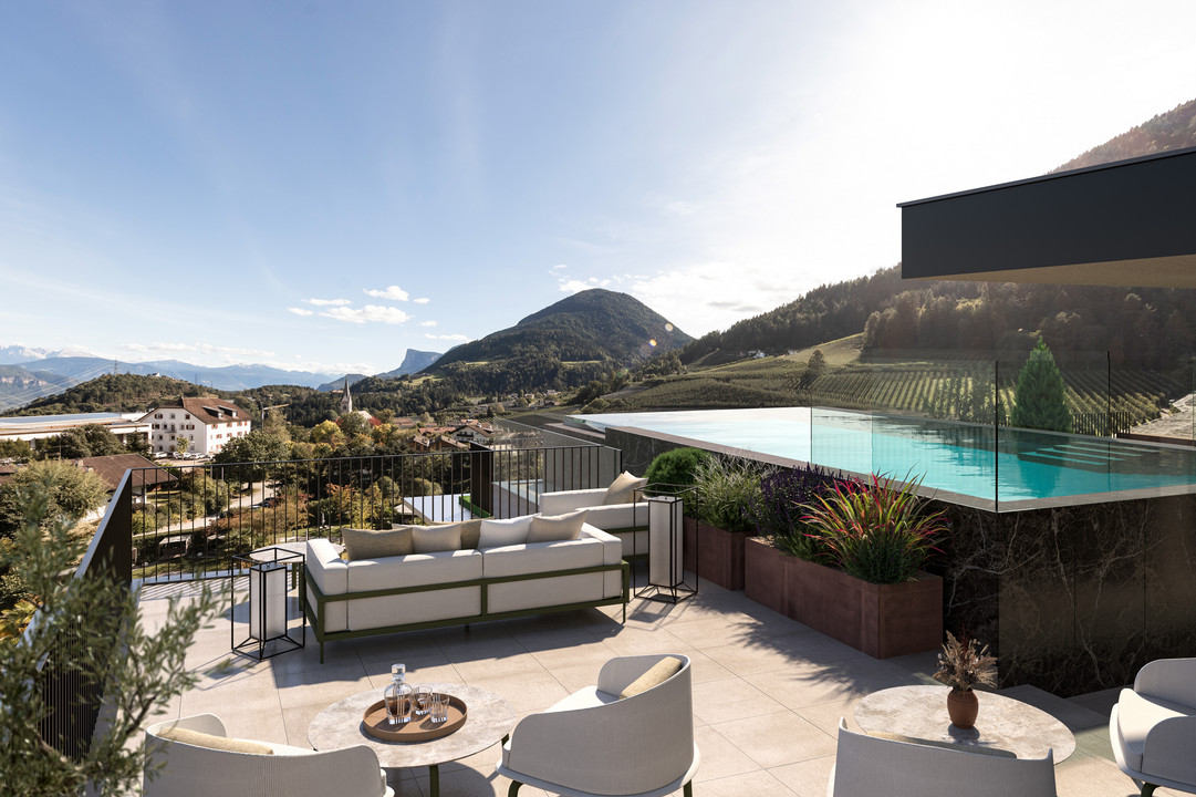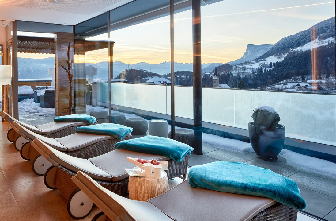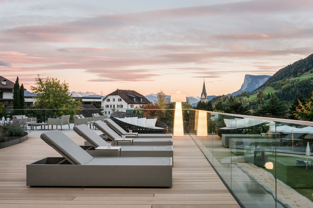 Der Name des neuen ALCIELO kommt nicht von ungefähr: Wer hier entspannt, fühlt sich dem Himmel nah – und ist es auch. Hoch oben, in den letzten beiden Stockwerken des ALPIANA, hoch über dem Poolgarten und über den Dächern der Bäume, darf der Blick bis in die Dolomiten ziehen!