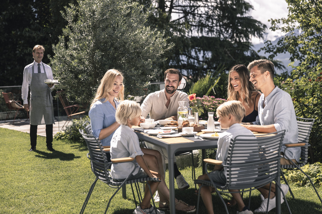 Hier dürfen Sie den Alltag vor der Tür liegen lassen. Sie dürfen den Tag in unserem Spa verbringen, in unserem bunten Garten, auf unserer weitläufigen Terrasse. Sie dürfen genießen: die bunte Küchenvielfalt, das Aktivprogramm mit Yoga, Wandern oder Radfahren, die Spa-Behandlungen oder am besten einfach jeden Moment. Freuen Sie sich auf: zwei Spa-Bereiche – einer davon Adults Only, der andere für Familien –, eine Gartenlandschaft mit beheiztem Pool, eine herzliche Gastgeberfamilie und die Möglichkeit, die Südtiroler Umgebung hautnah zu erleben. Bis bald? Es würde uns freuen.