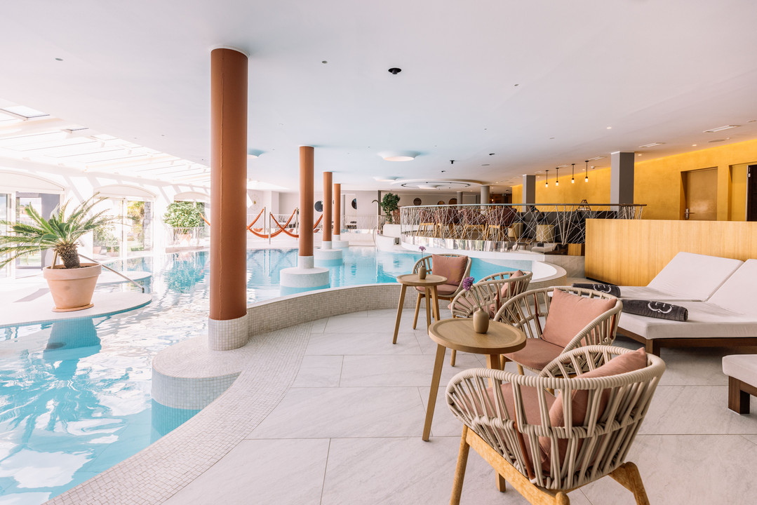 - Hallenbadbereich für Familien: mit bequemen Liegen, Daybeds und Hängematten, einem Loungebereich sowie diversen Dress on Saunen: Dampfbad, Infrarotkabine und Sanarium.