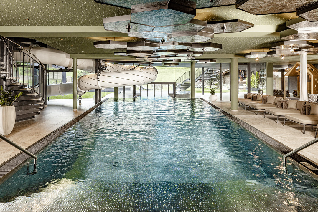 - Family: Neuer 25m Pool (32°C) in- und outdoor, 60m lange Wasserrutsche als Highlight für die Kinder, Wasserspielewand mit Lichteffekt, Baby Pool (34°C), Wärmegrotte und „Dress-On“ Bio-Sauna für die ganze Familie